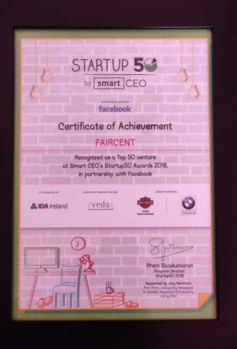 Faircent recognized as a Top StartUp50 Venture at the Smart CEO's StartUp50 Awards.