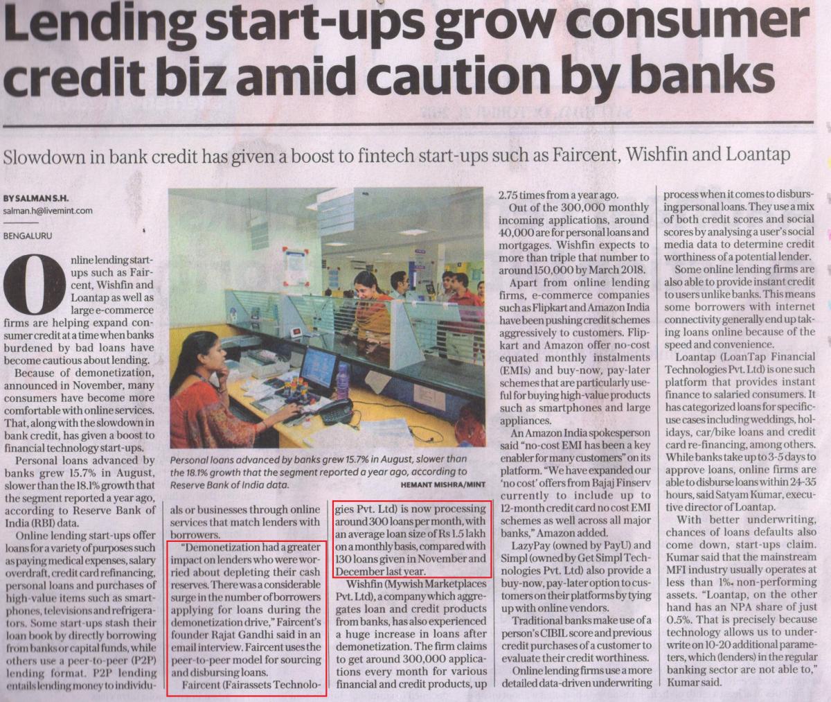 Wishfin (Mywish Marketplaces Pvt. Ltd), a company which aggregates loan and credit products from banks, has also experienced a huge increase in loans after demonetisation. The firm claims to get around 300,000 applications every month for various financial and credit products, up 2.75 times from a year ago.