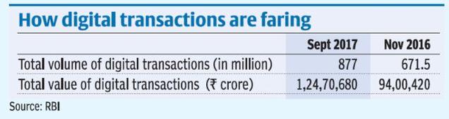 According to government sources, digital transactions since demonetisation have grown manifold on a month-on-month basis. For instance, volume wise, transactions via NACH, IMPS, UPI+BHIM and Rupay have grown to ₹1,47,624 crore in September 2017, against ₹1,07,987 crore in October 2016. Similarly, transactions through debit cards, credit cards, NEFT, RTGS and mobile wallets have grown from ₹1,07,59,649 crore in October 2016 to ₹1,23,28,369 crore as of July this year.