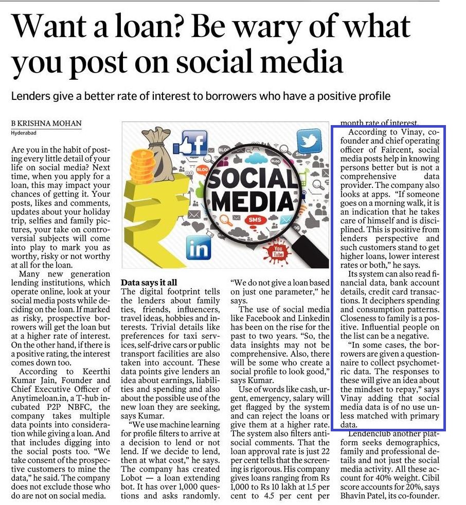 Are you in the habit of posting every little detail of your life on social media? Next time, when you apply for a loan, this may impact your chances of getting it. Your posts, likes and comments, updates about your holiday trip, selfies and family pictures, your take on controversial subjects will come into play to mark you as worthy, risky or not worthy at all for the loan.