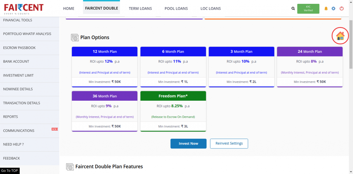 - Depending on tenure Faircent double plans offers returns up to 12% p.a (flat)