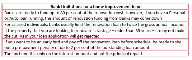 Also, most banks usually finance up to 80 per cent of the renovation and the balance has to be borne by the customer. Additionally, the final amount sanctioned by the bank depends on the sum quoted by a certified architect, your repayment capacity, and the total worth of the property. (refer to the box).