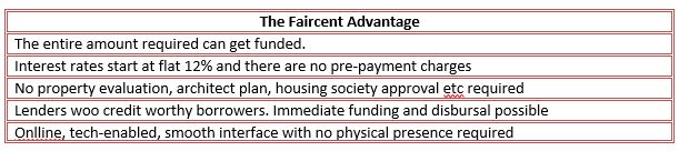 If the above process sounds intimidating, don’t fret. If you don’t want to bank upon a bank for funding, you could consider signing up with a Peer-to-Peer/ P2P loan facility like Faircent.com. It is less cumbersome and involves less paperwork and credit worthy borrowers can get easy personal loans at lower or comparable interest rates. The paper work is similar to any other personal loan and we do not require property papers, approval from architect or housing society. For credit worthy borrowers, the entire fund amount can be approved for funding and the P2P loan rate starts at 12% with no pre-payment charges and flat processing fees. (refer to the box) Sounds too good to be true. Register now! Because every % counts.