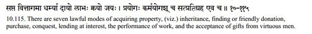 Manu Smriti 10.115. There are seven lawful modes of acquiring property, (viz.) inheritance, finding or friendly donation, purchase, conquest, lending at interest, the performance of work, and the acceptance of gifts from virtuous men. [6]