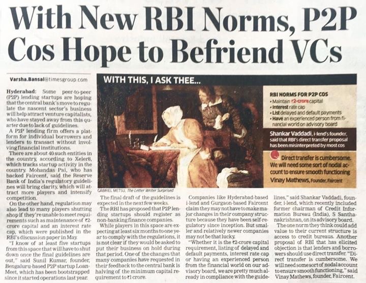 "Whether it is the `2-crore capital requirement, listing of delayed and default payments, interest rate cap or having an experienced person from the financial world on our advisory board, we are pretty much already in compliance with the guidelines," said Shankar Vaddadi, founder, i-lend, which recently included former chairman of Credit Information Bureau (India), S Santhanakrishnan, on its advisory board.